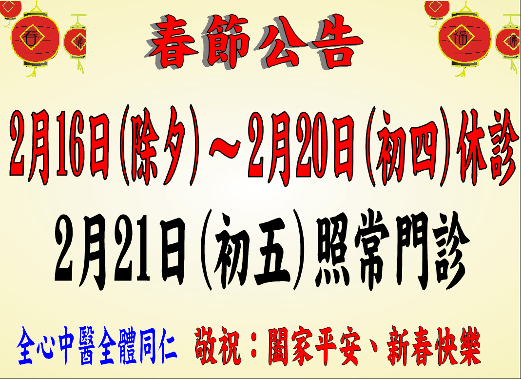農曆年節將至~~~ 本診所春節連假休診時間如下